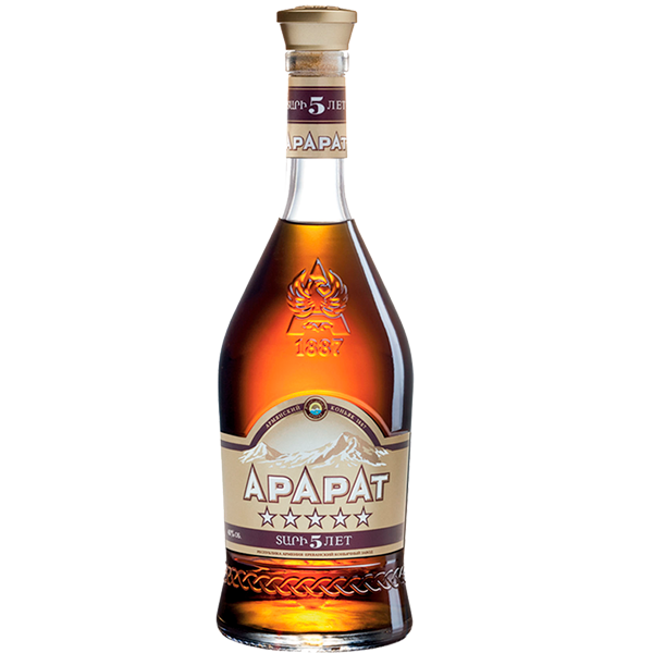Коньяк «Арарат 5 звезд» — отличный выбор для того, чтобы отпраздновать важное событие в жизни, проявить душевную щедрость и разделить с друзьями и близкими самые яркие моменты. Выдержка — 5 лет. Крепость — 40 %. Коньяк обладает нежным, освежающим ароматом сливы, персика и сухофруктов с оттенком черного шоколада, а его тонкий, деликатный вкус сочетает интенсивность черной смородины с мягкими сладковатыми нотами. Рекомендуется употреблять в чистом виде, а также в коктейлях.